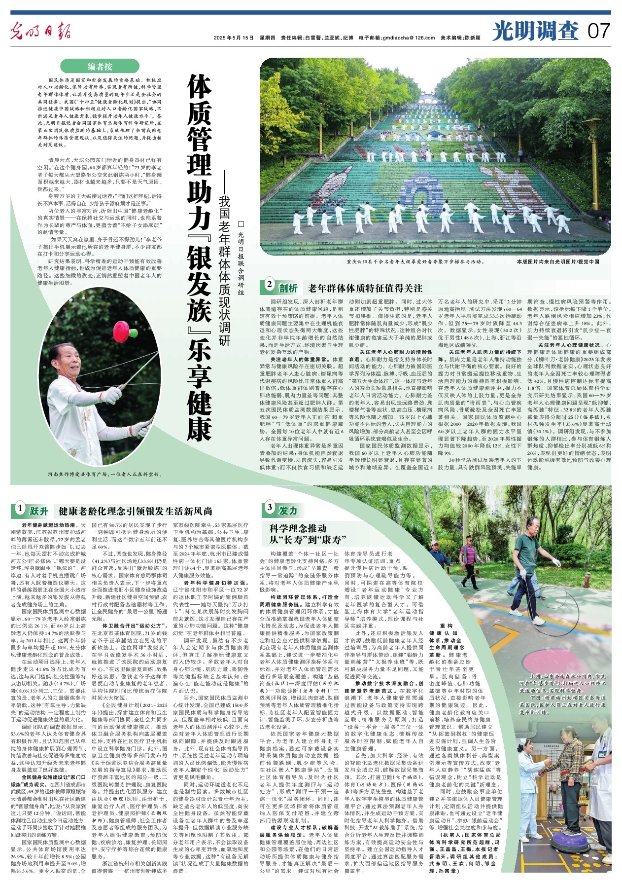 国民体质是国家和社会发展的重要基础。积极应对人口老龄化,保障老有所养,实现老有所健,科学管理老年群体体质,让其享受高质量的晚年生活是全社会的共同任务。我国《“十四五”健康老龄化规划》提出,“协同推进健康中国战略和积极应对人口老龄化国家战略,不断满足老年人健康需求,稳步提升老年人健康水平”。鉴此,光明日报记者会同国家体育总局体育科学研究所,在第五次国民体质监测的基础上,系统梳理了当前我国老年群体的体质管理现状,以及值得关注的问题,并提出相关对策建议。