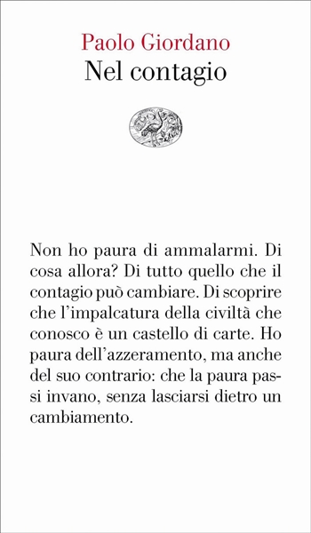 该书是焦尔达诺的罗马封城手记,封面素洁,白底黑字地印着:“我不怕得病。那我怕什么?在传染病能改变的一切事中,怕的是发现我所知的文明构架是一座纸牌屋。我害怕归零,但也怕它的反面,怕这恐惧白白地过去,留不下任何改变。”