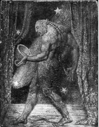 与艺术史上众多“大作”相比,它的尺寸相当袖珍:21.4cm×16.2cm,却大名鼎鼎,许多论者都曾谈及。G.K.切斯特顿(Chester⁃ton)在所著传记《威廉·布莱克》(WilliamBlake,1910)中对这幅画进行了极为精到的描述与阐释。在他看来,这幅画仅题目本身就说明了布莱克为什么是一个如此有趣的人物。这个奇特而让人觉得莫名其妙的题目首先说明了布莱克是一个令人无法忽视的、近乎荒唐的存在——谁又会想到画“跳蚤的幽魂”呢?画中的生物似乎行走在一座巨塔高大的廊道中,最吸引人眼球的是它长而突兀的脊骨,一直延长到脑后,以至整个后背像石砌塔一般。它的面部既像鹰,又像猪,眼睛闪闪发光,近乎疯癫。切斯特顿将其称作“异物”(“thething”),认为它令人毛骨悚然,不寒而栗。更为重要的是由于上述细节,这个造物真实可信,像一个深夜悄无声息穿过走廊的高大的吸血鬼,很容易便可触发观者对画中情境的“代入感”。正因为此,切斯特顿指出,布莱克所描绘的不是跳蚤,而是“跳蚤的理念”,也即是跳蚤之魂,由此为这幅画赋予了柏拉图的色彩:“跳蚤的幽魂比跳蚤本身还要牢固。与其幽魂咄咄逼人、硕大无比的在场相比,他(跳蚤)的躯体则模糊不清、古怪奇异。”