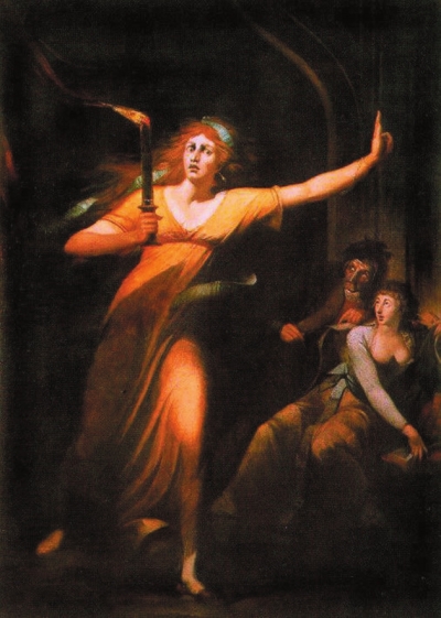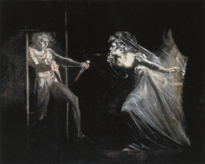 富塞利创作了许多莎士比亚作品中的人像画自不待说,仅是《麦克白》中的人物就有多幅,如《麦克白与无头幻象对话》(MacbethConsultingtheVisionoftheArmedHead)、《麦克白与班柯及女巫》(Macbeth,BanquoandtheWitches)、《梦游中的麦克白夫人》(LadyMacbethSleepwalking)和《持剑的麦克白夫人》(LadyMacbethSeizingtheDaggers)等等。