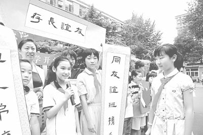 ③北京市西中街小学与北新桥小学在西中街小学操场上联合举行开学典礼。这两所小学刚刚结为手拉手联盟学校。 刘丽景、周良摄