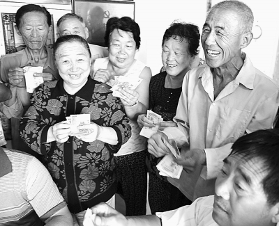 近年来,河北省迁安市在全省率先探索实施新农保制度,人均月领养老金上百元,迁安市每年为农民支付养老金5600余万元。这是该市迁安镇周洪庄村农民在领取养老金。