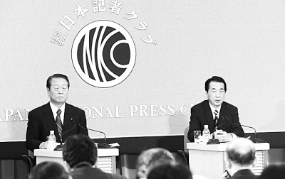 图为9月2日,在日本东京的日本记者俱乐部,日本首相、执政的民主党代表(党首)菅直人(右)和民主党前干事长小泽一郎进行辩论。 新华社发