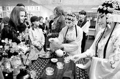 在美术宫内则展示着别具特色的中国茶艺、刺绣、民间手工艺、现代动漫……在入口处的茶艺展台,身着古典民族服装的妇女站在古朴的茶具面前,向观众展示中国茶艺的无穷魅力,观众纷纷要求与献艺的茶女照相留念。一位俄罗斯妇女被美轮美奂的茶艺所吸引,禁不住走上前去,请求品一杯中国茶。当她如愿以偿地品尝了清香四溢的绿茶后,带着满意的笑容离开展台,走向下一个展厅。在杭州刺绣展台,一位绣花女正向人们展示精湛的双面绣艺术。她面前是一幅即将完成的作品,表现的是一位漂亮的芭蕾舞女演员。绣花女用她精巧的双手把一位舞姿优美的芭蕾舞演员表现得惟妙惟肖,令围观的俄罗斯参观者赞叹不已。
