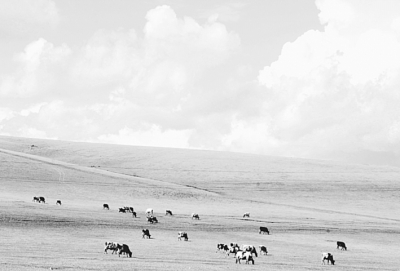 高耸的大陆板块空旷恒大,弓起球面的脊线。草原把最广阔的空间留给七彩泛滥。芳草年年绿,碧色直铺天涯。千万种花如潮水,汹涌漫卷草原。乳汁洗出的天空,云舒云卷如峨峨高髻、荡荡裙裾。苍鹰盘旋,大道似瀑布。