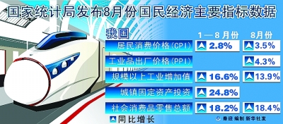 统计显示,1-8月份,城镇固定资产投资同比增长24.8%;8月份,社会消费品零售总额同比增长18.4%,比7月份加快0.5个百分点。投资和消费两大指标都继续保持了稳定较快增长的态势。
