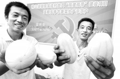 湖北省赤壁市柳山湖镇易家堤村党员“双建双带”项目蔬菜生产示范基地由6户党员为47个农户提供种植技术培训,年产值达2150万元左右。目前技术辐射全镇6个行政村,为农民增收作出了积极贡献。图为9月12日,两位示范者收获香瓜。