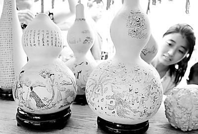 | 9月12日,在聊城葫芦文化节上,一名女子在观看古画工艺葫芦。 在山东省聊城市举办的葫芦文化艺术节上,当地乡村艺术家创作的各种“创意葫芦”交易红火,为期3天的文化节共签订订单50余份,交易额达320万元。聊城市自2007年开始举办葫芦文化艺术节,今年已是第四届,有效地促进了当地葫芦创意产业的发展。 张宪举摄 |