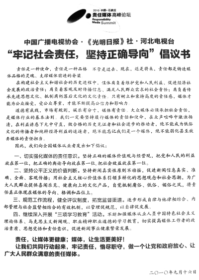 论坛上,本报与中国广播电视协会、河北电视台联合发出“牢记社会责任,坚持正确导向”的倡议。