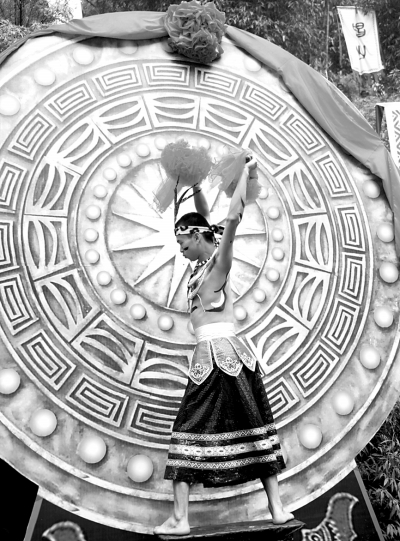 | 9月16日,一名表演人员在“唱山祭水”大典上敲击特制的直径4.8米的铜鼓。当日,“2010中国·贵州黄果树瀑布节‘唱山祭水’大典”在黄果树大瀑布举行,这是黄果树大瀑布自2004年以来连续第7次举办“唱山祭水”大典,以表达“圣祭瑰丽山水、祈福国泰民安”的美好愿望。新华社发(古尚台摄) |
