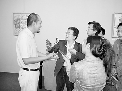 | 9月18日白明陶艺作品展在巴黎中国文化中心开幕。展出的60余件作品,具有传统青花的精美、典雅与纯净,又符合现代人的审美观,受到观众好评和艺术界的关注。白明现为清华大学美术学院讲师,是中国现代陶艺杰出的青年艺术家,2004年曾获得国内陶瓷艺术推广贡献奖。此次展览是在巴黎中国文化中心和法国布瓦西埃大学孔子学院的共同组织下举办的,图为白明在开幕式上与观众交谈。本报记者 姚立摄 |