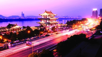 灯火璀璨迎佳节 灯火璀璨的长沙杜甫江阁和湘江大道。中秋节、国庆节临近,夜幕下的长沙灯火璀璨、霓虹闪烁,处处洋溢着浓烈的节日氛围。新华社记者 龙弘涛摄
