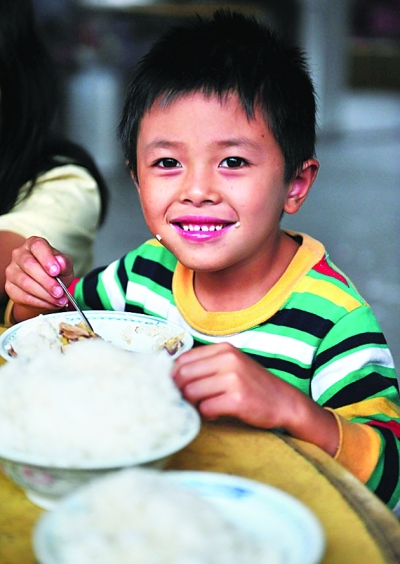 9月22日,安置点里的孩子吃到了热腾腾的饭菜。受台风“凡亚比”影响,钱排镇双合村、河背村等地600余村民被迫转移到这里,其中包括大量儿童。 新华社记者 梁旭摄