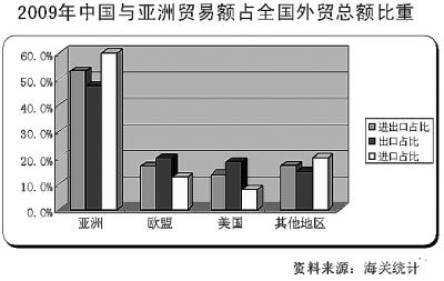 三是我国与亚洲相互依存度不断上升,我国市场对亚洲经济的重要性日渐突出。在我国10大贸易伙伴中,亚洲国家和地区占6个。国际金融危机以来,我国已成为公认的亚洲经济增长的主要动力。主要表现在:一是我国自亚洲进口增幅远高于对亚洲出口,贸易逆差持续扩大。今年1-7月,我方逆差已达到648亿美元,比去年同期增加3.55倍,创历史同期最高水平。二是我国在主要贸易伙伴对外出口中所占比重显著上升。例如,根据各国最新统计,对华出口占日本对外出口总额的19.0%、占韩国的25.1%、占泰国的10.9%,均比去年同期有较大提升。三是我国在亚洲各国和地区对外贸易中的地位不断提高。我国已多年保持日本、韩国、朝鲜、蒙古、越南等国最大贸易伙伴地位。2009年,我国首次超过美国,成为日本最大的出口市场;重新成为印度最大贸易伙伴;超过新加坡、美国和日本,成为马来西亚最大的贸易伙伴。我国在东盟贸易伙伴的排名从2008年的第4位升至2009年的第3位。