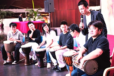 9月26日下午,著名打击乐演奏家李飚(右一)在国家大剧院花瓣厅与北京大学“鼓玩儿”打击乐社团的同学们一起即兴合奏,为即将于10月6日开幕的“2010国际打击乐节”预热。届时,将有来自世界各地的四十余位打击乐大师在近十天中演出6场音乐会。