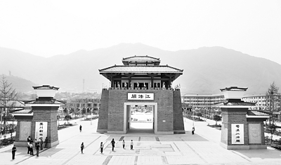 唐山的援建者则费尽心血在南坝镇把抗震文化和历史文化进行了深入挖掘。在新场镇连心广场正前方,是一座高20米、宽18米的江油关仿古城楼。城楼里面是一个小型博物馆,一侧是抗震纪念馆,用一张张真实的图片记载着身边抗震救灾、灾后重建的感人场景。另一侧则是南坝历史纪念馆,用绘画、图片等形式,展示南坝镇的文化典故和历史资料。广场正中是一座下沉式凹台,中间是座抗震纪念碑,围墙则是用唐山瓷砖烧制的军民抗震图。