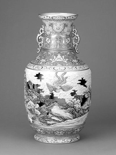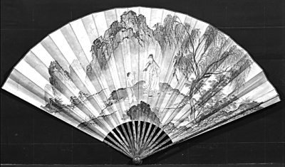 上图为“首届世界华人典藏大展”中的乾隆洋彩雕瓷转心瓶。下图为故宫“明永乐宣德文物展”中的朱瞻基山水人物扇。