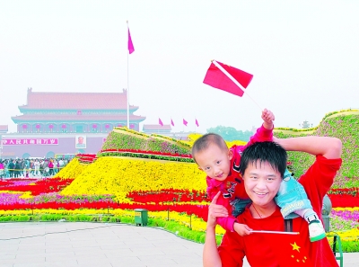 北京天安门广场搭建的以“花开盛世”为主题的大型中心花坛,寓意祖国繁荣富强、国泰民安,游客们驻足观看、拍摄留念。图为在国庆假日里,一位年轻的父亲和他儿子让家里人拍照,留下这美好瞬间。本报记者 郭红松摄