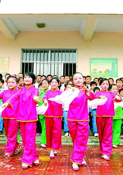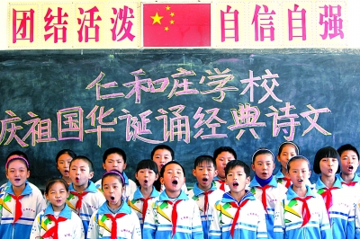 | 上图:“在世界的东方,有一个古老的国度,美丽而宽广;在世界的东方,有一个伟大的民族,勤劳而坚强。”新中国成立61周年之际,河北省保定市白沟新城仁和庄学校“庆国庆诗歌朗诵会”上学生们充满激情的朗诵表达了对祖国母亲的由衷赞美。该校70%的学生是外来务工人员的子女,为丰富他们的文化生活,培养其爱读书、常读书、读好书的良好习惯,学校开展了“书香伴我成长,经典陶冶人生”朗诵活动。 左图:10月3日,山东省博兴县吕艺镇京博希望小学举办了“吕剧进校园 欢度国庆节”活动,这是学生们在演唱“青春吕剧”。本报记者 刘新武摄 |