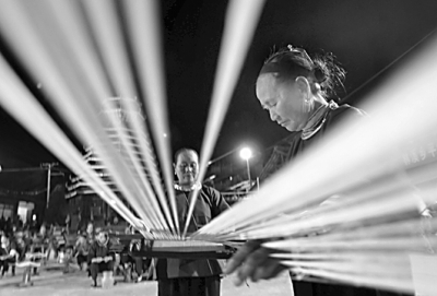 10月3日晚,广西三江侗族自治县平铺村的妇女展示梳理棉线技术。国庆长假期间,广西三江侗族自治县平铺侗寨推出侗布制作工艺展示,上百名侗族妇女进行纺纱、织布和捶布等侗布传统制作工艺展示,为侗乡的节日增添了浓厚的民族风情,吸引众多游客观看。