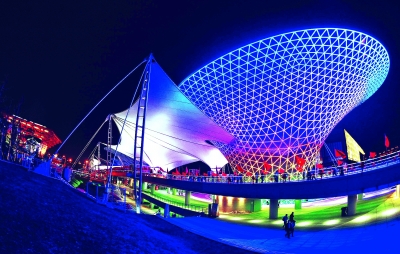 这是10月6日拍摄的上海世博园夜景。假日的上海世博园灯光璀璨,夜色迷人。 新华社记者 张国俊摄