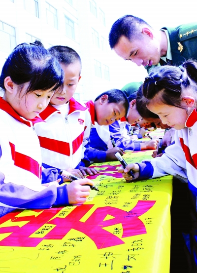 | 日前,山东省滨州市沾化县滨海乡小学与滨海边防派出所共同开展了“热爱祖国、勤奋学习、立志成才”系列活动,通过唱红歌和签名等活动,进一步坚定了师生和官兵们的爱国之心和报国之志。 本报记者刘新武 通讯员高峰摄 |