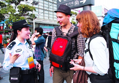| 国庆长假以来,每天有近30万人次的中外旅客通过铁路来到上海参观世博和旅游,客流量超过了历年同期。为确保广大旅客平安出行,上海铁路警方加强警力巡查,全力维护乘车秩序,严密安全防范措施,主动热情服务旅客,为世博安保创造了温馨、舒适、安全的乘车环境。图为上海火车站民警正在用英语耐心回答外籍旅客的问询。林荣贵摄 |