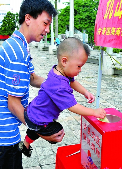 | 十月十日,海口一名家长抱着孩子为灾区捐款。海南省志愿者协会从十月八日起开展『我们在行动』公益活动,呼吁爱心企业和社会各界人士,为遭受洪涝灾害的地区捐款、捐物、捐水、提供急需的食品、药品、生活用品。新华社记者 夏冠男摄 |