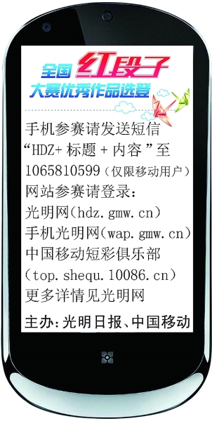 网站参赛:登录光明网活动官网(hdz.neamco.com)、手机光明网(wap.neamco.com/hdz)或者中国移动短彩俱乐部(top.shequ.10086.cn)上传作品。