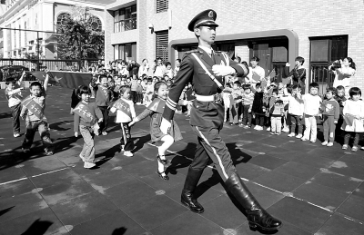 | 10月11日,北京东城区崇文第二幼儿园与社区儿童共同开展“爱国旗、爱祖国”主题爱国主义教育活动,成立“小小国旗护卫队”,邀请天安门国旗护卫队战士给队员示范升旗动作和仪式,讲述国旗知识。 本报记者 赵洪波摄 |