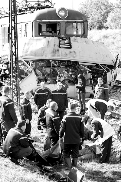 10月12日,救援人员在乌克兰东部第聂伯罗彼得罗夫斯克州的交通事故现场工作。当日,第聂伯罗彼得罗夫斯克州发生一起长途公共汽车与火车机头相撞的严重交通事故。据最新消息,事故造成至少43人死亡、9人受伤。新华社发