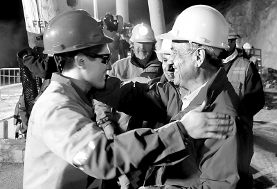 十月十三日,在智利圣何塞铜矿,第四名升井矿工玻利维亚人卡洛斯·马马尼(左)被救出地面后与智利总统皮涅拉拥抱。新华社发