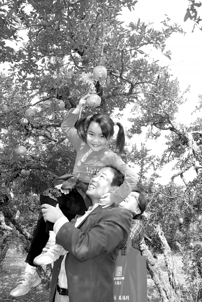 国庆到来,山东省枣庄市峄城区冠世榴园内的10余万亩石榴,似盏盏红灯点缀田野。八方游客畅游其间,尽享收获的乐趣。图为游客在喜摘石榴。 本报记者 邢兆远 通讯员 张大东摄