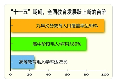 张力:“十一五”期间,全国教育发展跃上新的台阶,九年义务教育人口覆盖率达99%,接近全面普及;高中阶段毛入学率提升27个百分点,实现了80%的预期目标;高等教育稳步发展,毛入学率从21%增至25%。如果说,新世纪第一个五年我国初步实现了从人口大国向人力资源大国的转变,到第二个五年末,则可以说这一转变的基础更为牢靠。