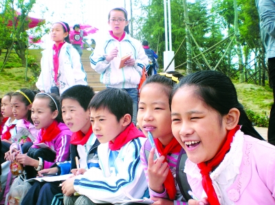 郑州绿博园规划面积2939亩,绿化面积130万平方米,湖面、湿地等水系320亩,种植植物1000多种、63.6万株,其中既有南方的桂花,也有北方的国槐;既有东北的白桦,也有西北的胡杨,还有来自加拿大的紫荆等异国植物,堪称集天下绿色于一园,成了又一观光旅游休闲好去处。郑州鹤立小学四年级一班的同学们来到这里上作文课,图为10月12日,孩子们开心赏景快乐作文。 本报记者 崔志坚摄
