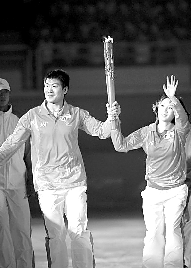 上午10点,传递仪式在哈尔滨八区体育场冰球馆揭幕,冰球馆内洋溢着节日般的气氛。馆内设有LED大屏幕,在每位火炬手传递的过程中,屏幕上都会播放他们与体育结缘的故事画面。在传递过程中,“中国加油”的呐喊声不绝于耳,全场观众挥动着手中的五星红旗,兴高采烈。最后一棒火炬手是双人滑世界冠军张丹/张昊,两人配对参加双人滑比赛已经有12年,2006年都灵冬奥会上,张丹在抛四周失败受伤的情况下,顽强地重回赛场完成比赛并夺得银牌,以实际行动诠释了奥运精神,令世界为之动容。今天,两人一同擎起火炬完成了传递后并一起用火炬的火焰点燃火炬盆。整个传递活动与冰上表演相融合,既宣传了亚运精神,又展示了哈尔滨冰雪文化及冰雪体育魅力。压轴节目由首枚冬奥会金牌得主、双人滑夫妻档申雪/赵宏博完成,他们为家乡人带来的正是两人在冰上婚礼时所表演的《天下无双》,这段美轮美奂的精彩演出也为这次传递画上了圆满的句号。