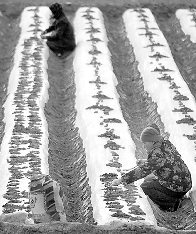 甘肃靖远县乌兰镇营房村农民在利用双垄沟播技术种植马铃薯(2010年3月24日摄)。甘肃省近年来在干旱地区大力推广旱作农业新技术——全膜双垄沟播技术,经过实践证明可以增产粮食30%以上。 新华社记者 聂建江摄