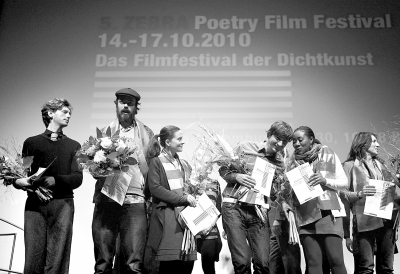 10月17日,在德国柏林举行的第五届“斑马”诗歌电影节上,获奖者在台上领奖。第五届“斑马”诗歌电影节当天颁奖后闭幕。本届电影节共有来自71个国家和地区的900余部诗歌电影参与奖项角逐,最后获奖的影片从26部入围竞赛单元的影片中选出。未能到场领奖的德国导演罗伯特·波勒和马丁·亨策共同导演的诗歌影片《康妮的马》(The Pony of Conny)获得本届诗歌电影节最佳影片奖。