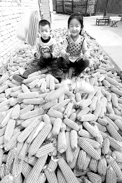 山西省临汾市安泽县和川镇沁河庄村孩子们正在收获的玉米堆上玩耍。农业部统计显示,今年秋粮已连续六年取得了丰收。 本报记者 刘新武摄