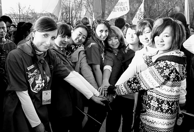| 2010年俄罗斯“汉语年”中俄青少年联谊活动今天落下帷幕。本次活动由我国教育部主办,历时3天,举办了中俄青少年专场文艺晚会、中俄大学生联谊篝火晚会、中俄大学生联欢会、中俄大学生美术作品展等系列活动。图为中俄两国大学生携起友谊之手。 本报记者 朱伟光摄 |