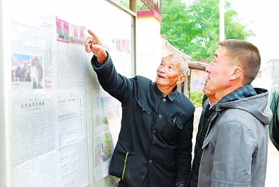 | 10月21日,河北省任丘市季家铺村农村宣传员季树伟利用阅报栏向村民宣讲中共十七届五中全会精神。季树伟老人是一位有着45年党龄的老党员,十几年来,这位老人坚持自费订阅党报,并义务向村民宣传党的富民政策和农业科普知识。 本报通讯员 刘俊杰摄 |
