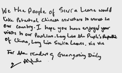 我们,塞拉利昂人民衷心希望中国投资商到我们的国家投资。我希望您在我们的展馆参观愉快。中华人民共和国万岁,塞拉利昂万岁。谢谢。