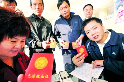 10月29日,合肥市爱心出租车队的“的哥的姐”们展示义务献血证。当日,合肥市50多名爱心出租车车队的司机来到合肥市中心血站义务献血。