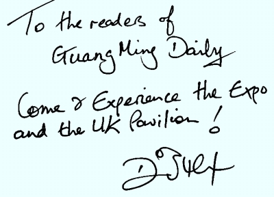 上图为本报记者刘军采访英国馆副馆长马丁及马丁先生为本报读者题词:欢迎来英国馆体验世博。大卫·马丁