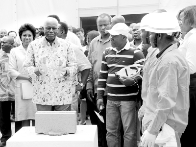 11月8日,在安哥拉首都罗安达东部卡仁格区,安哥拉总统多斯桑托斯(前左一)出席中国四川海山国际集团承建的卡仁格区旧城改造工程第一期工程开工仪式,并象征性地砌上第一块奠基砖。多斯桑托斯表示,安哥拉政府将逐步完成对首都罗安达全部老城区的改造。新华社记者 王丙飞摄