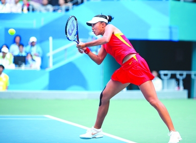 | 中国女子网球队今天战胜中华台北队获得广州亚运会团体冠军。图为中国队的张帅在与对手比赛。 |