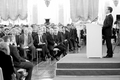 十一月三十日俄罗斯总统梅德韦杰夫(右)在莫斯科的克里姆林宫发表国情咨文梅德韦杰夫当天说如果俄罗斯与北约最终未就建立欧洲导弹防御系统达成一致可能触发新一轮军备竞赛 新华社发