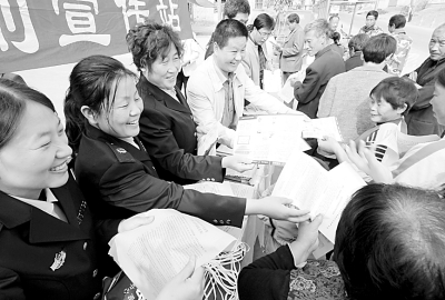 最近,山西省安泽县司法局在府城镇高壁村进行普法宣传。近年来,安泽县不仅在临汾市17个县市区经济发展连续排名第一,而且是“全国社会治安综合治理先进集体”、“依法治县先进典型”,该县104个行政村中有94%的村20年没有发生过刑事治安案件,有42%的行政村30年没有发生过刑事治安案件,甚至有些村自新中国成立以来没有发生过一起刑事治安案件。本报记者 刘新武摄