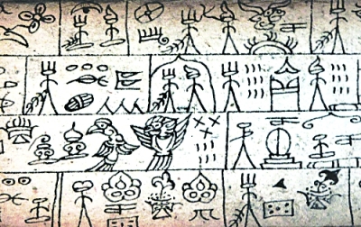 从文字自然形态发展的角度看,东巴文比甲骨文还要原始,属于文字起源的早期形态,最早是写画在木头和石头上的符号图像,后来随着纸的发明,纳西先民才把这些符号图像写在纸上,成为东巴文经典。东巴文中的每一图像符号都有它约定俗成的线条和笔法,形成固定所指的概念,并具备了表示某字、某词的符号。从保留下来的卷帙浩繁的《东巴经》看,留存至今的东巴经书和文献多达1500余种,共两万多册,其中属东巴经典的约有一千多部,广涉天文地理、宗教哲学、神话传说、民俗民风,被称为古代纳西族的“大百科全书”。