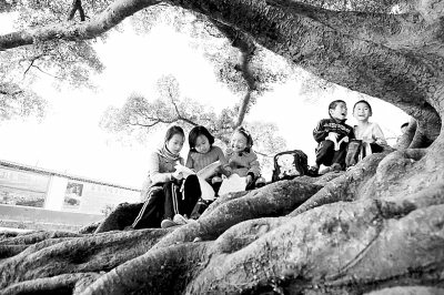 近日,一群放学后的小朋友在江西省龙南县里仁镇正桂村的古榕树下诵读古诗。该县在新农村建设中,开展了“阅读之城”活动,村村建阅览室和农家书屋,并组织开展了“十大读书家庭”、“十大读书少年”、“朗读大擂台”等活动,倡导村民养成“爱读书、喜看书、读好书”的良好习惯。